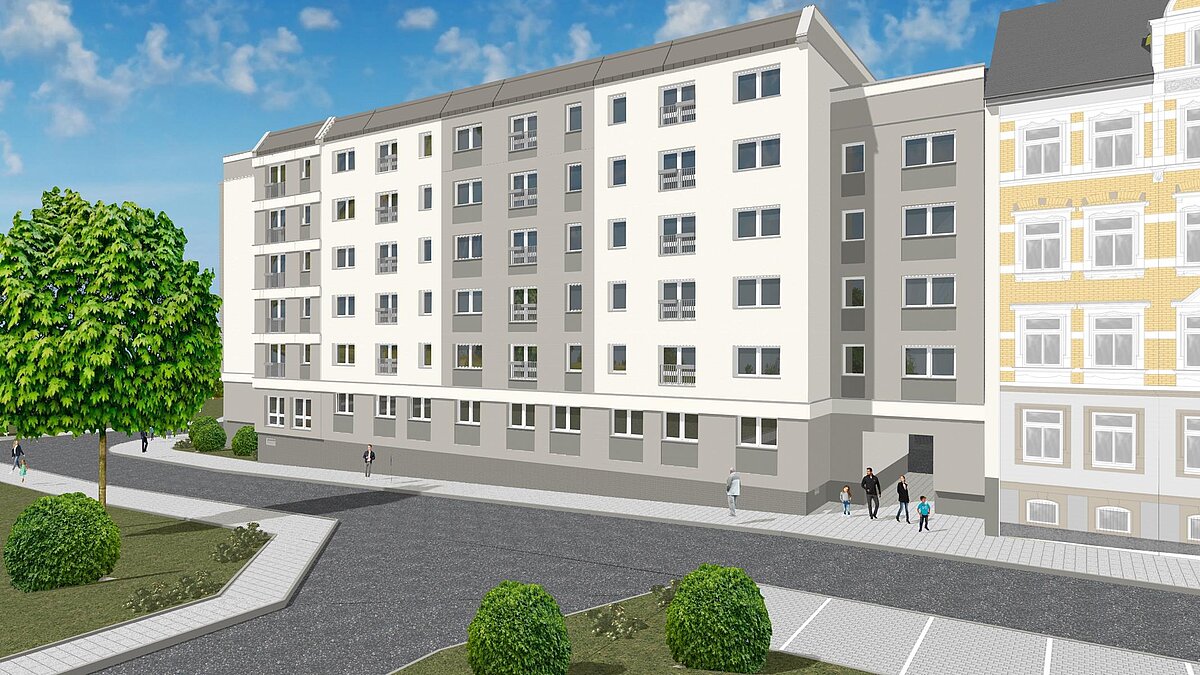 Seit September 2025 laufen die Sanierungsarbeiten in den Wohnhäuser Augustusburger Straße 28 sowie Theresenstraße 1 - 3 und 7 - 9a in der Chemnitzer Innenstadt.
